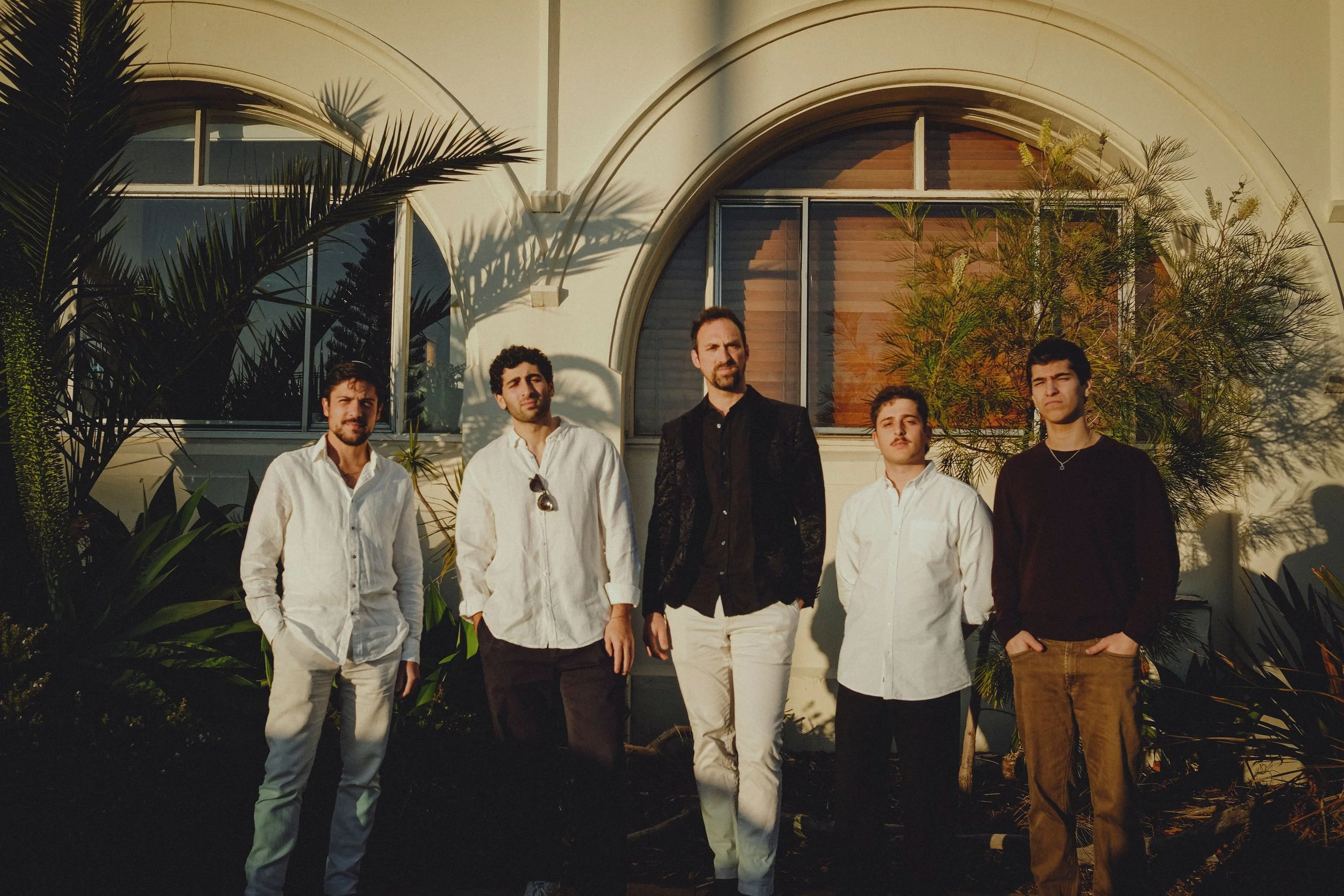 Five members of Balagan Band standing outdoors in front of large arched window and tropical plants, sunlight casting shadows